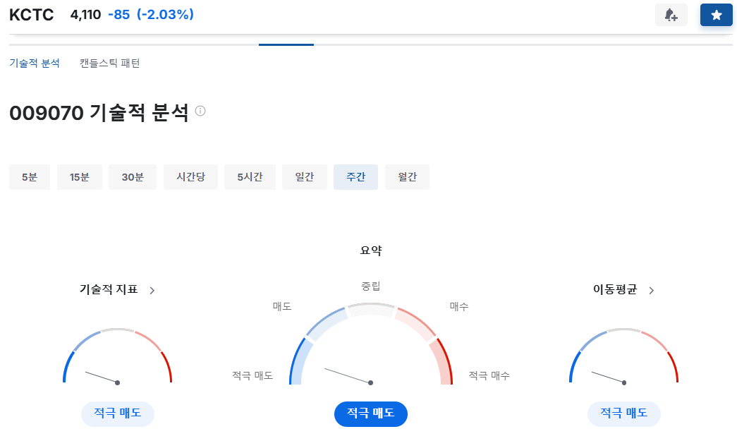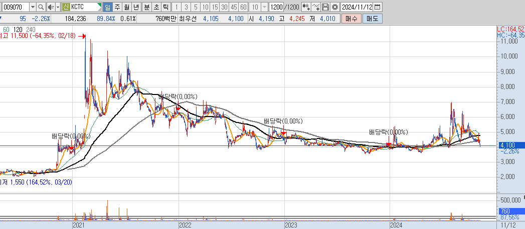 기술적인 관점에서 보면, 최근 1년 동안 KCTC의 주가는 7,030원에서 3,550원 사이에서 변동해왔으며, 현재 주가는 4,100원 정도에 위치해 있습니다. 거래량도 최근 들어 미미하며, 여러 기술적 지표상으로는 하락세가 이어지는 것으로 나타납니다.