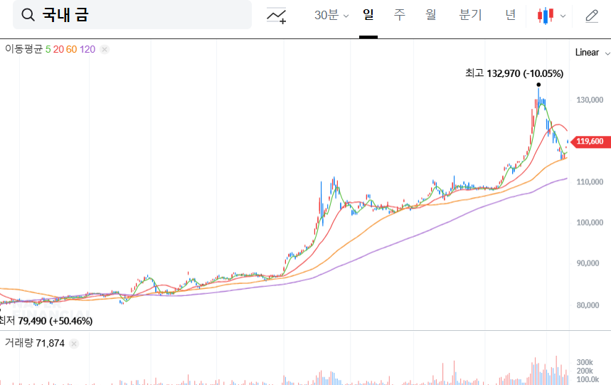 금 시세는 코로나를 기점으로 꾸준한 상승 추세로 글을 작성하는 24년 11월 20일에는 1g 당 약 11만~12만 사이의 가격을 형성하고 있습니다. 그래도 최근 고점 대비 10% 정도 하락한 상태라 저도 관심을 가지는 중!